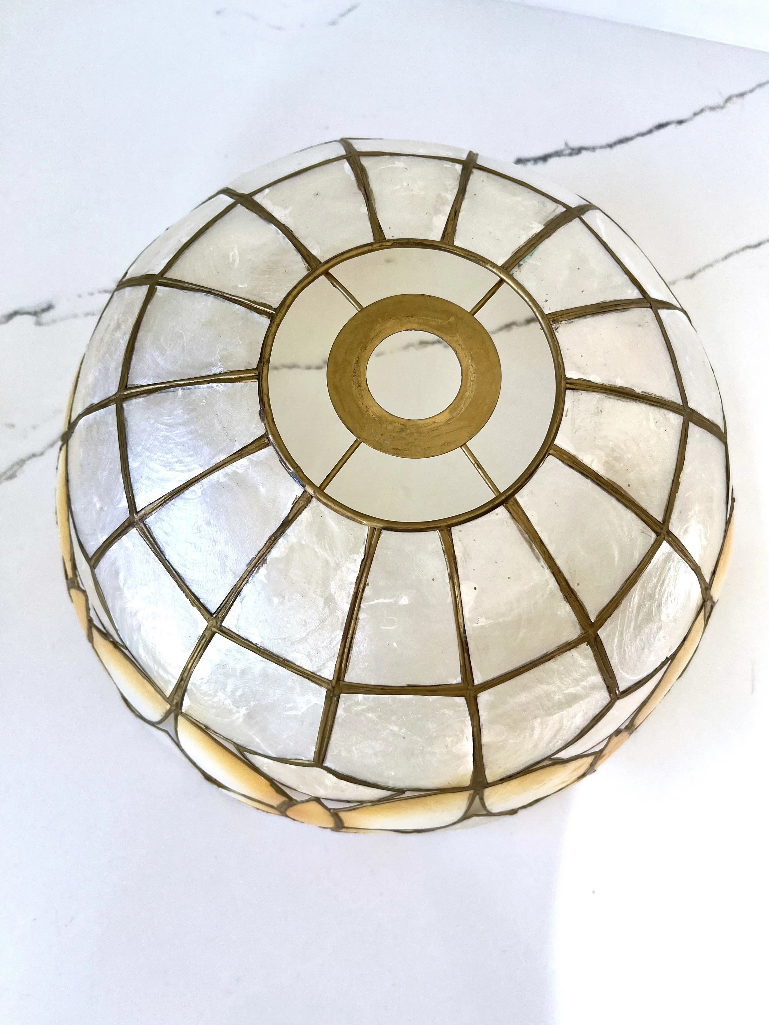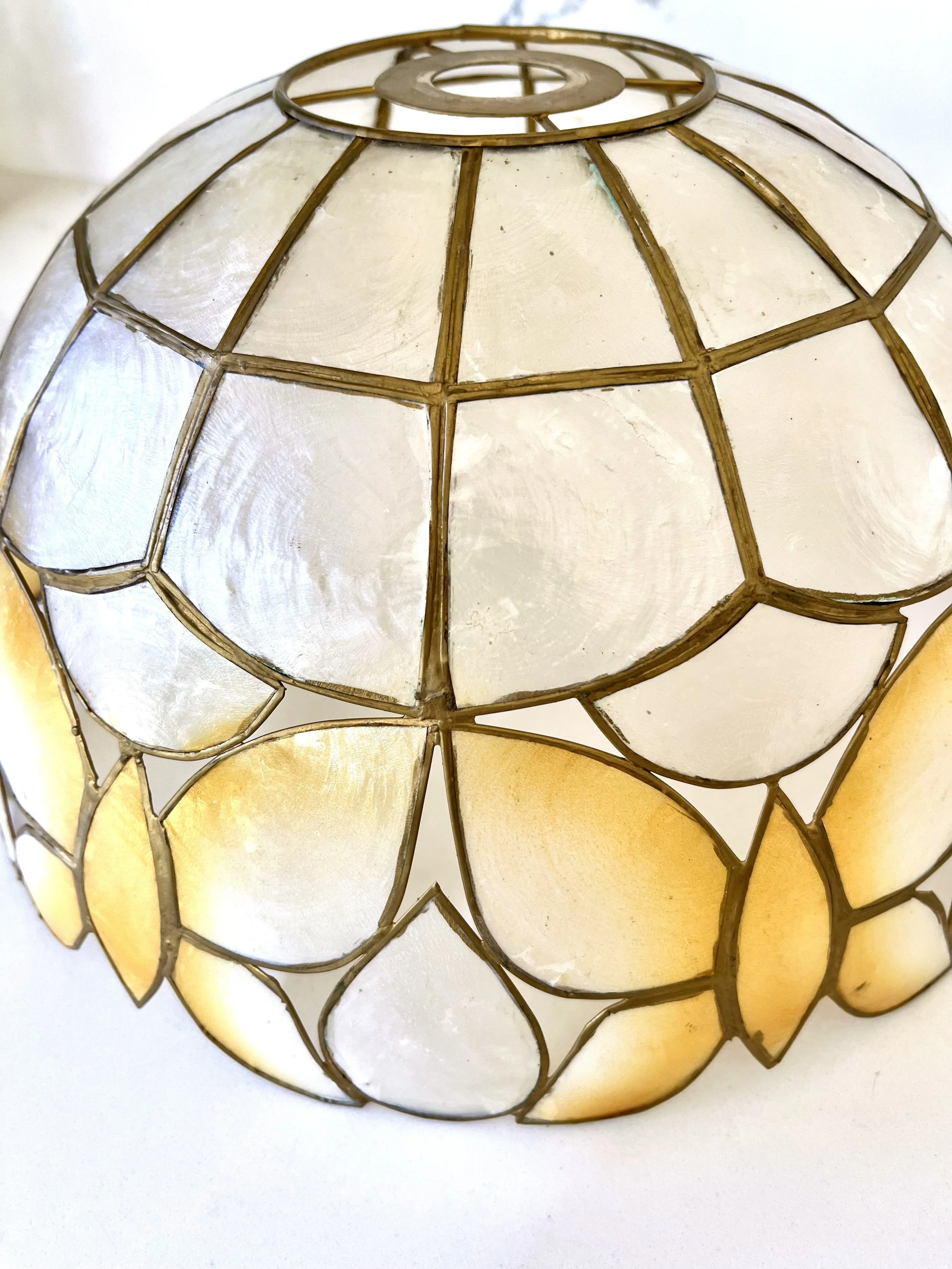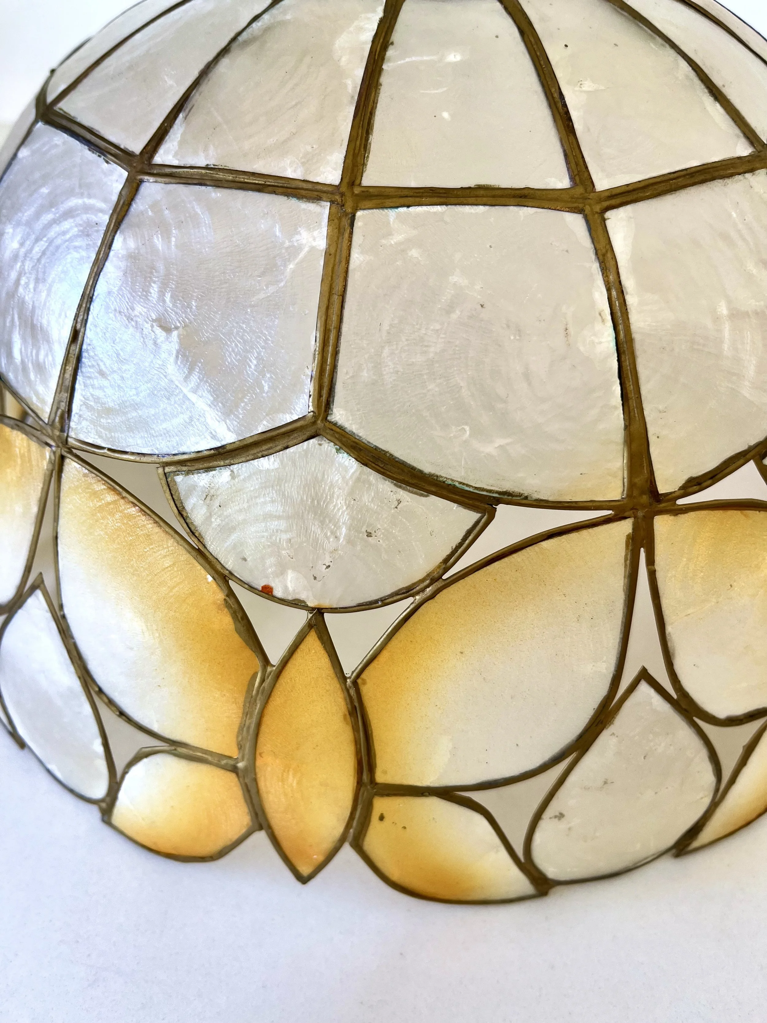 Great 1980s brass-framed Capiz shell hanging ceiling lampshade.